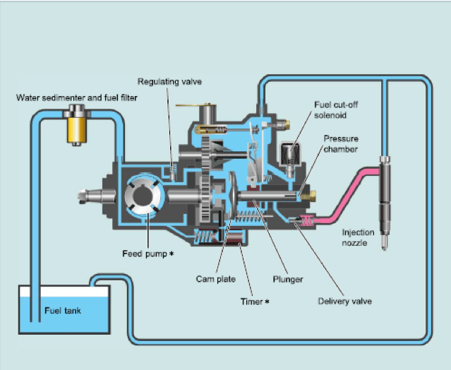 Waktu injeksi bahan bakar dikontrol oleh timer yang memberi respon ke tekanan di dalam pump housing