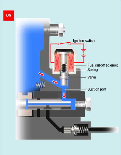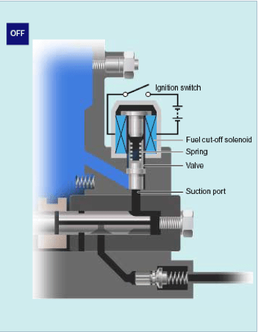 Arus, yang mengalir ke dalam solenoid, dipotong, menyebabkan valve mengarah ke bawah oleh pegas. Ketika valve menutup suction port, persediaan bahan bakar ke cylinder akan berhenti, menyebabkan mesin berhenti.
